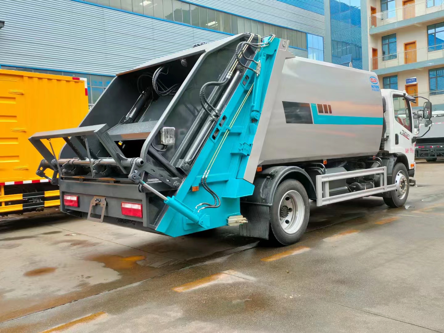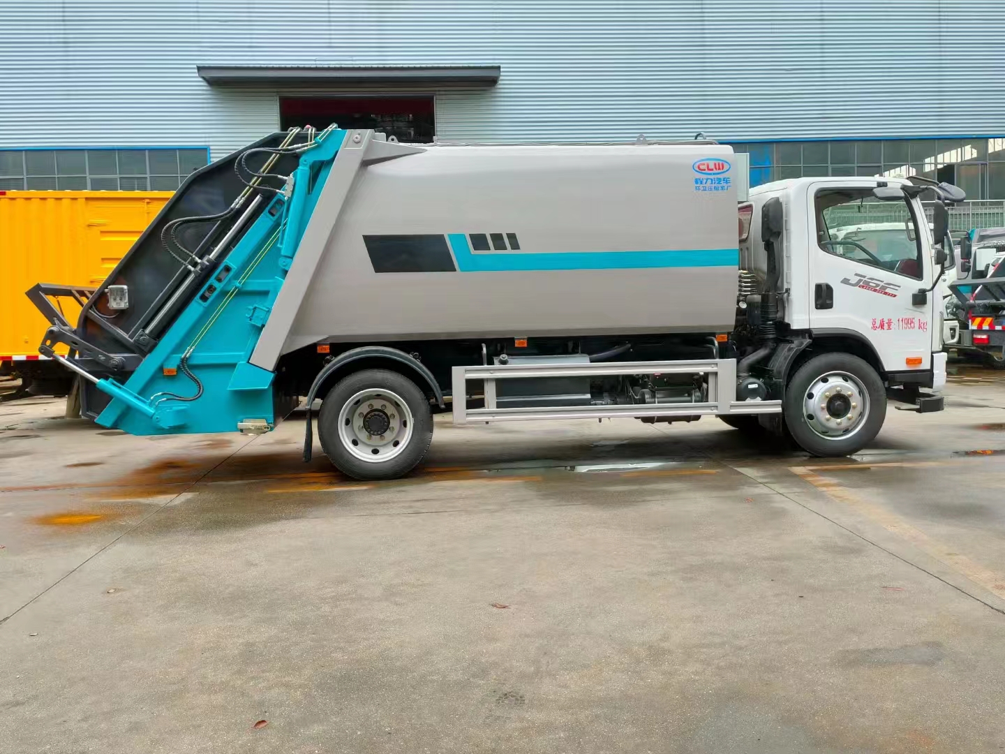 | 上裝配置 | 箱體容積11立方,采用邊四底四高強板制作,機器人自動焊,電泳工藝涂裝,威森博樂多路閥,皖液油泵,填裝器外置滑板油缸結構,尾部翻轉結構可掛120/240L垃圾桶。 | ||